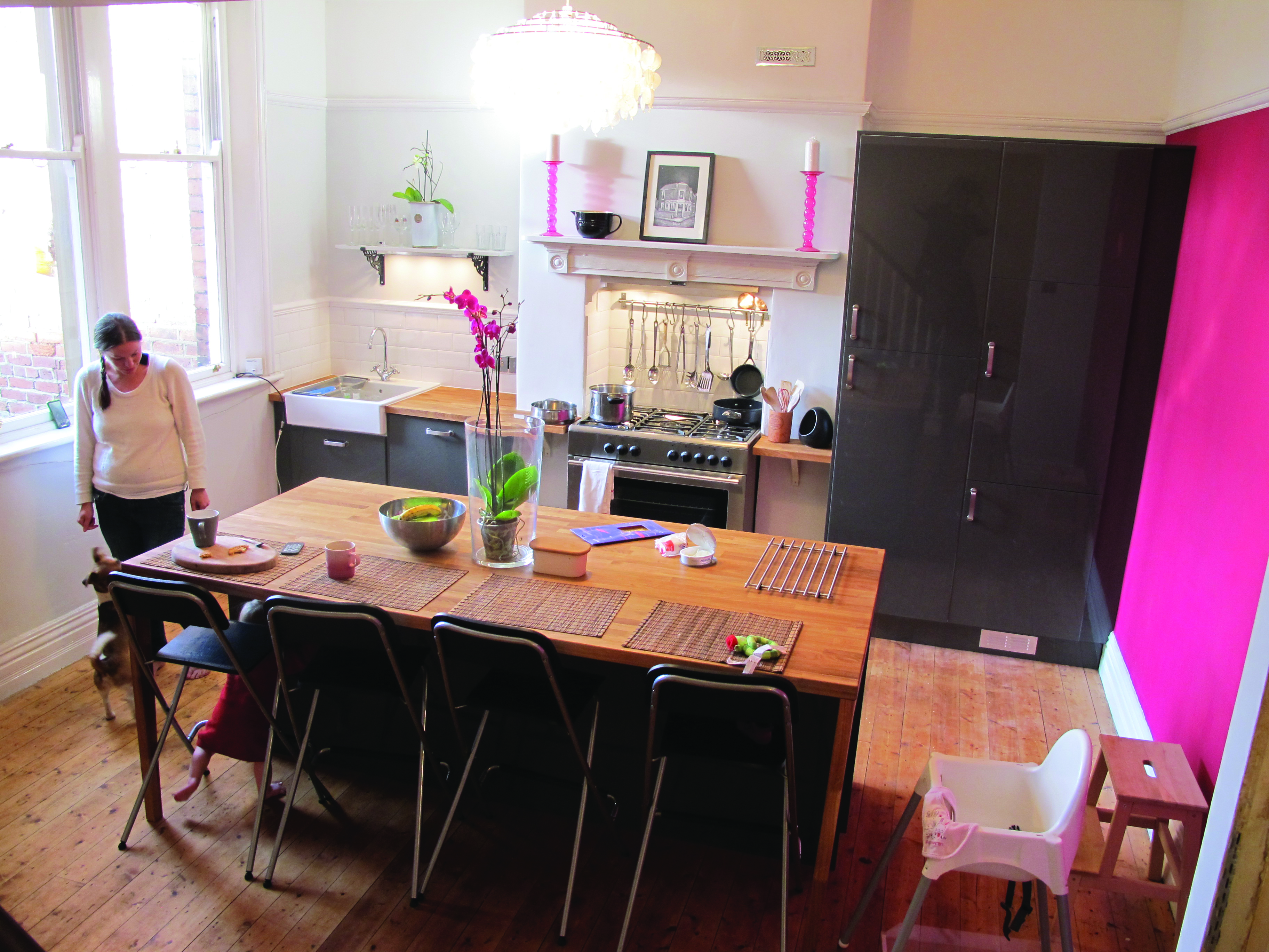 After removing the wall they decided to keep the old dining room door and upcycle it into a shelf unit. The door frame was then turned into a giant frame to surround the painted blackboard. This works beautifully against the bright pink wall. Colourful accents such as flowers and candlesticks are also used to complement the feature wall.