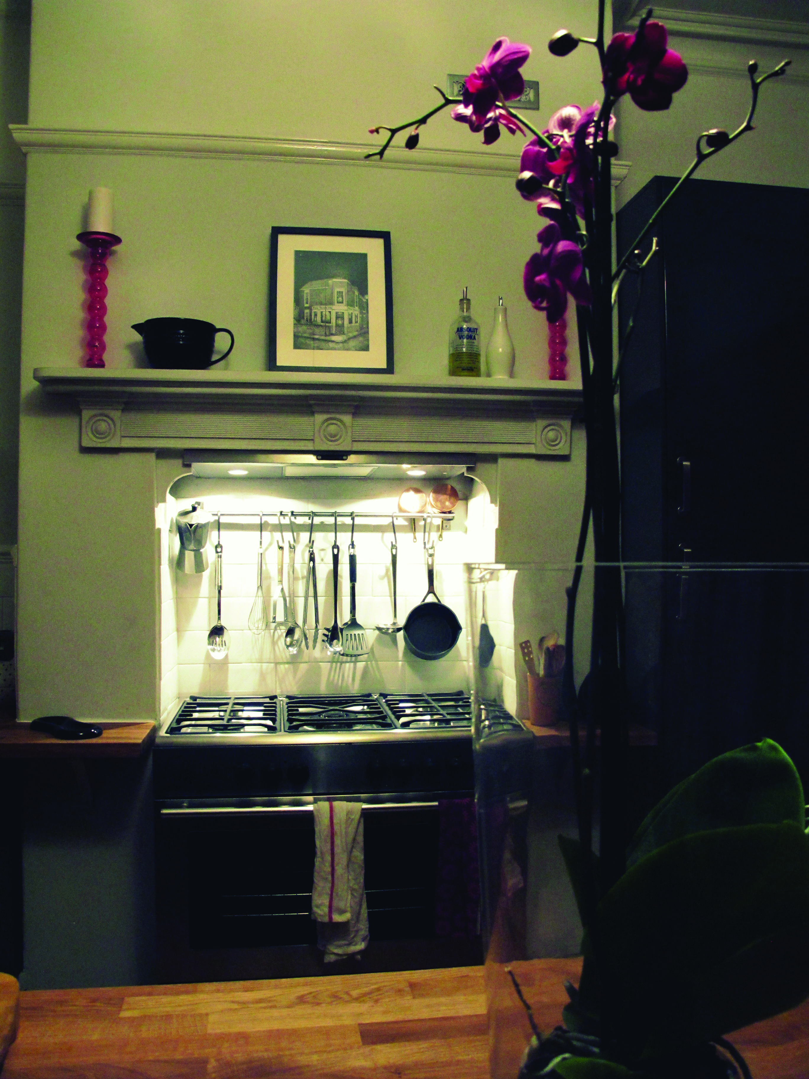 Above the large cooker positioned in what was once the fireplace, is a shelf that Martin rescued from a pile of firewood during a friend’s house move, and repurposed into a mantle feature. The shelf above the sink is perched upon cast iron hanging basket brackets, an ebay bargain of just £30.