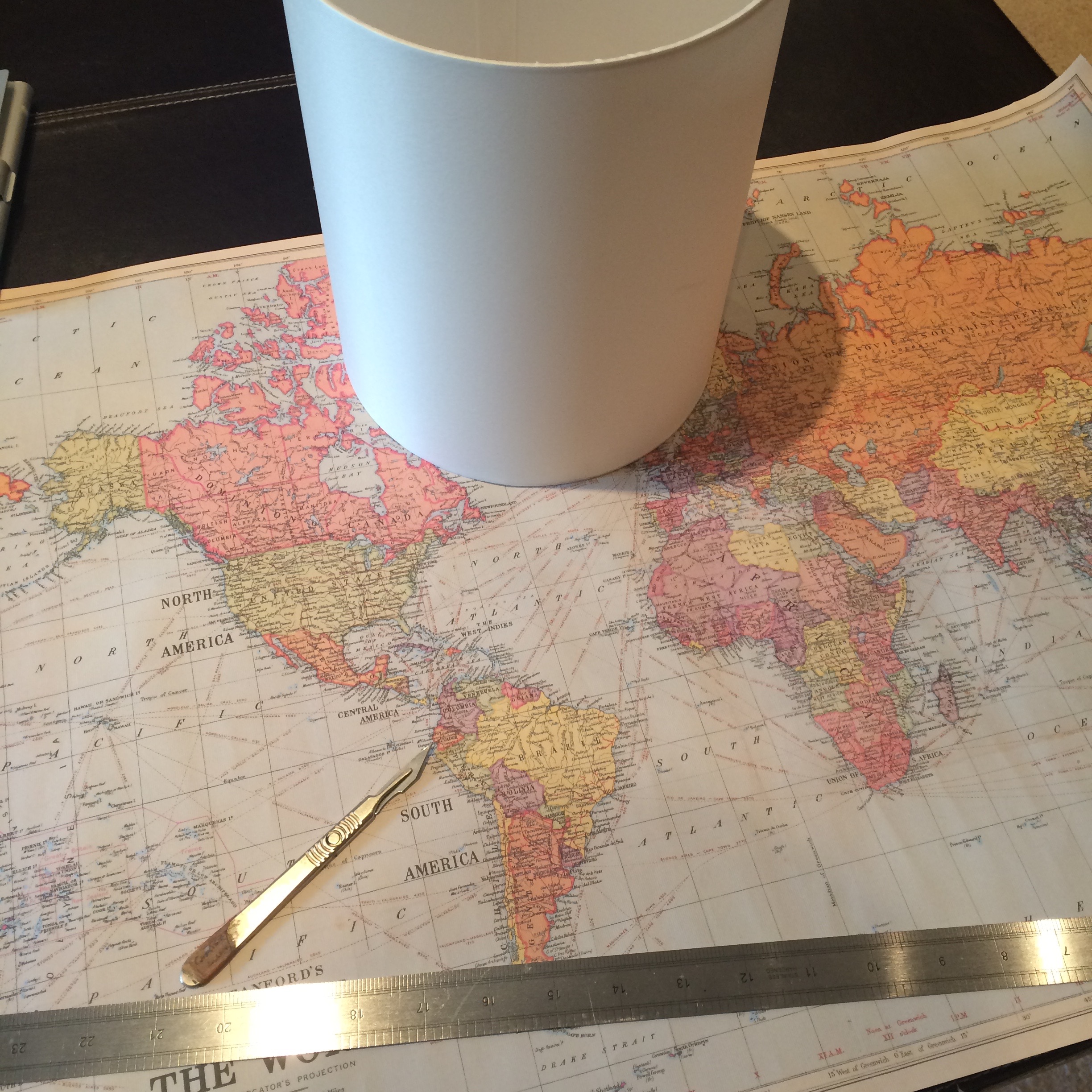 I had a boring cream lampshade that just didn’t add anything to my room. I’d also bought this sheet of map wrapping paper from Paperchase a little while ago for £3.50 and the two seemed destined to meet.
