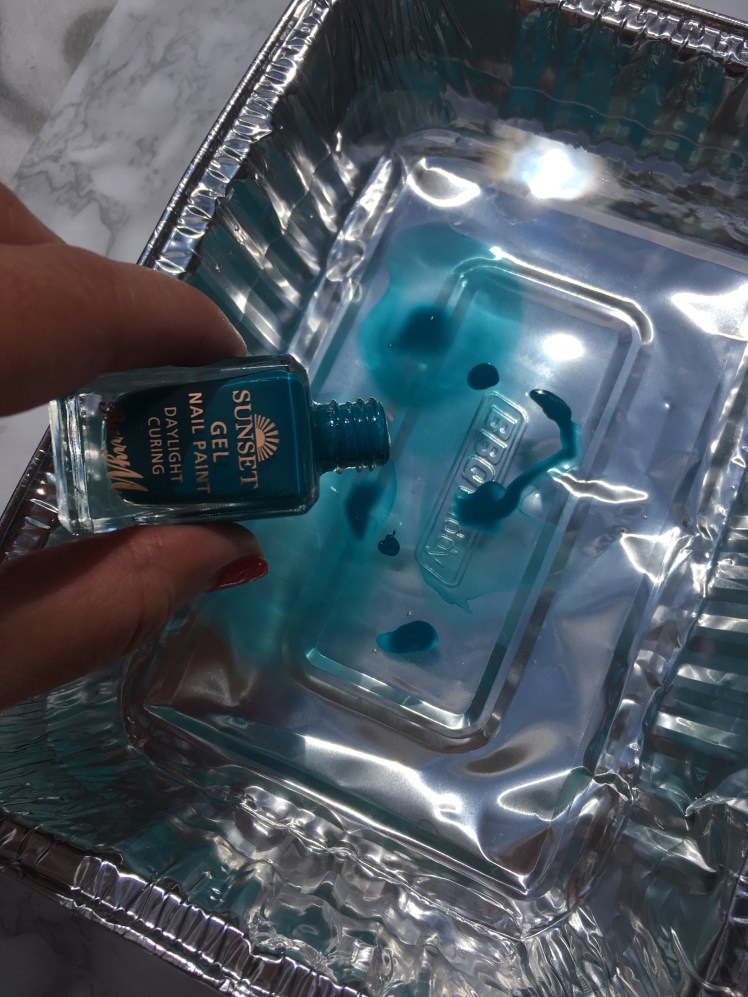 Pour 3-4 drops of your chosen colour onto the surface. Pour directly from the bottle, don’t use the brush. You need to pour quite close to the surface and then let the varnish spread on the top of the water. If you pour from a height it will drop to the bottom.