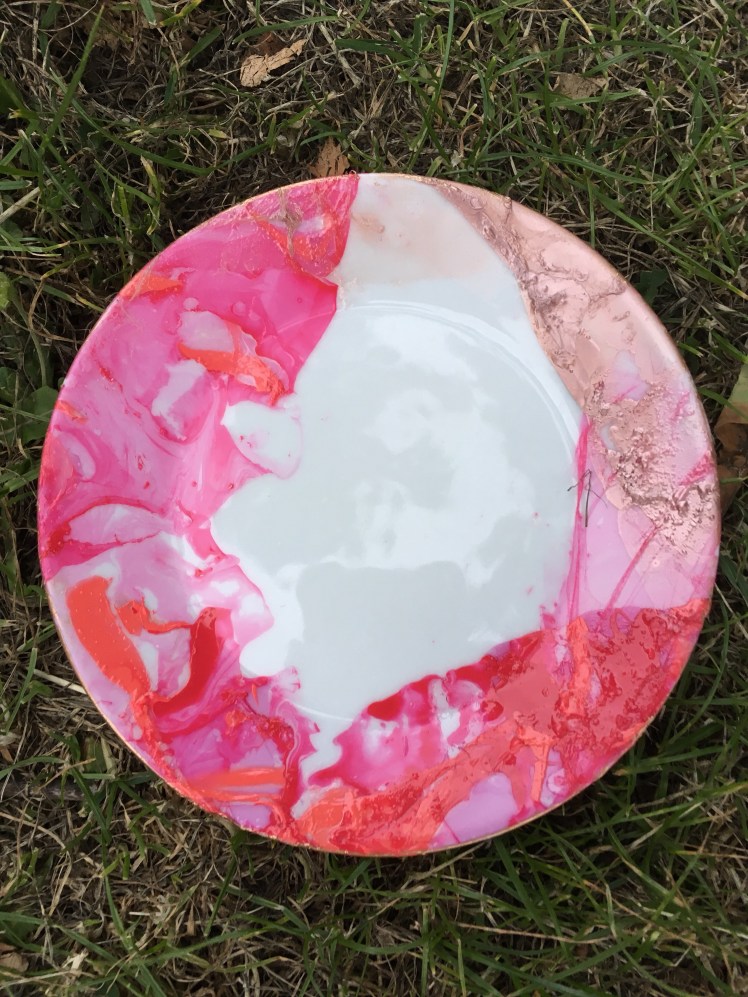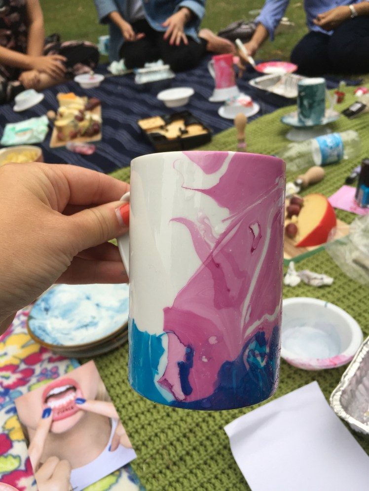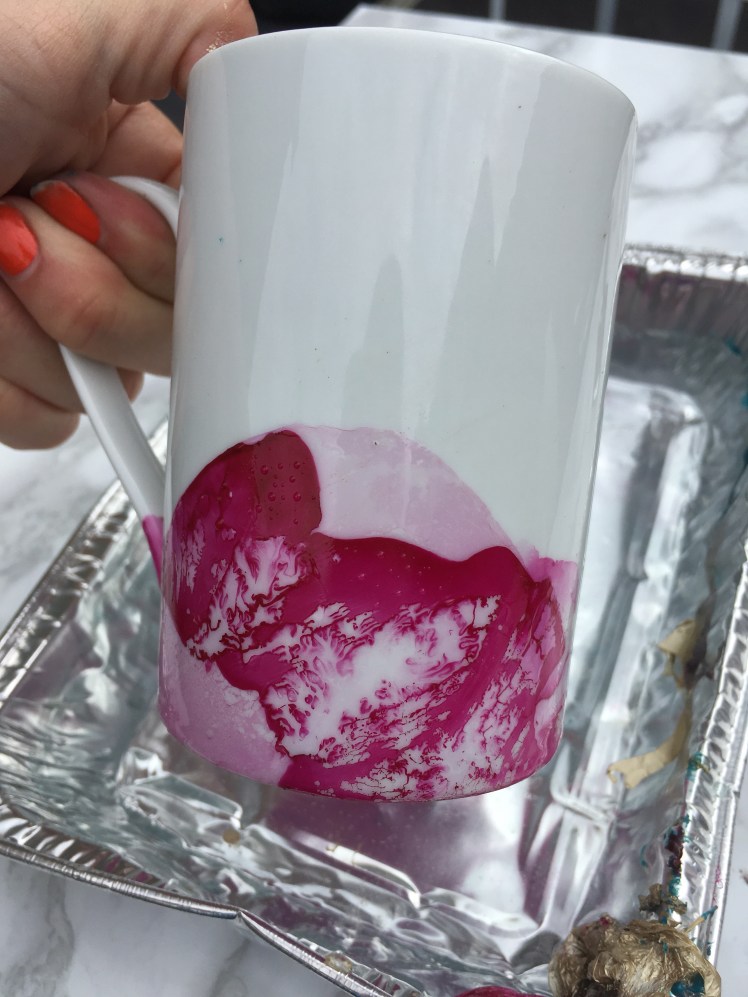 Pour drop of nail varnish into a dish of warm water, swirl with a cocktail stick and dip your cup. Leaving you with a beautiful marble pattern on your cup. Bish bash bosh.